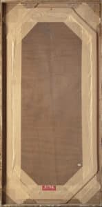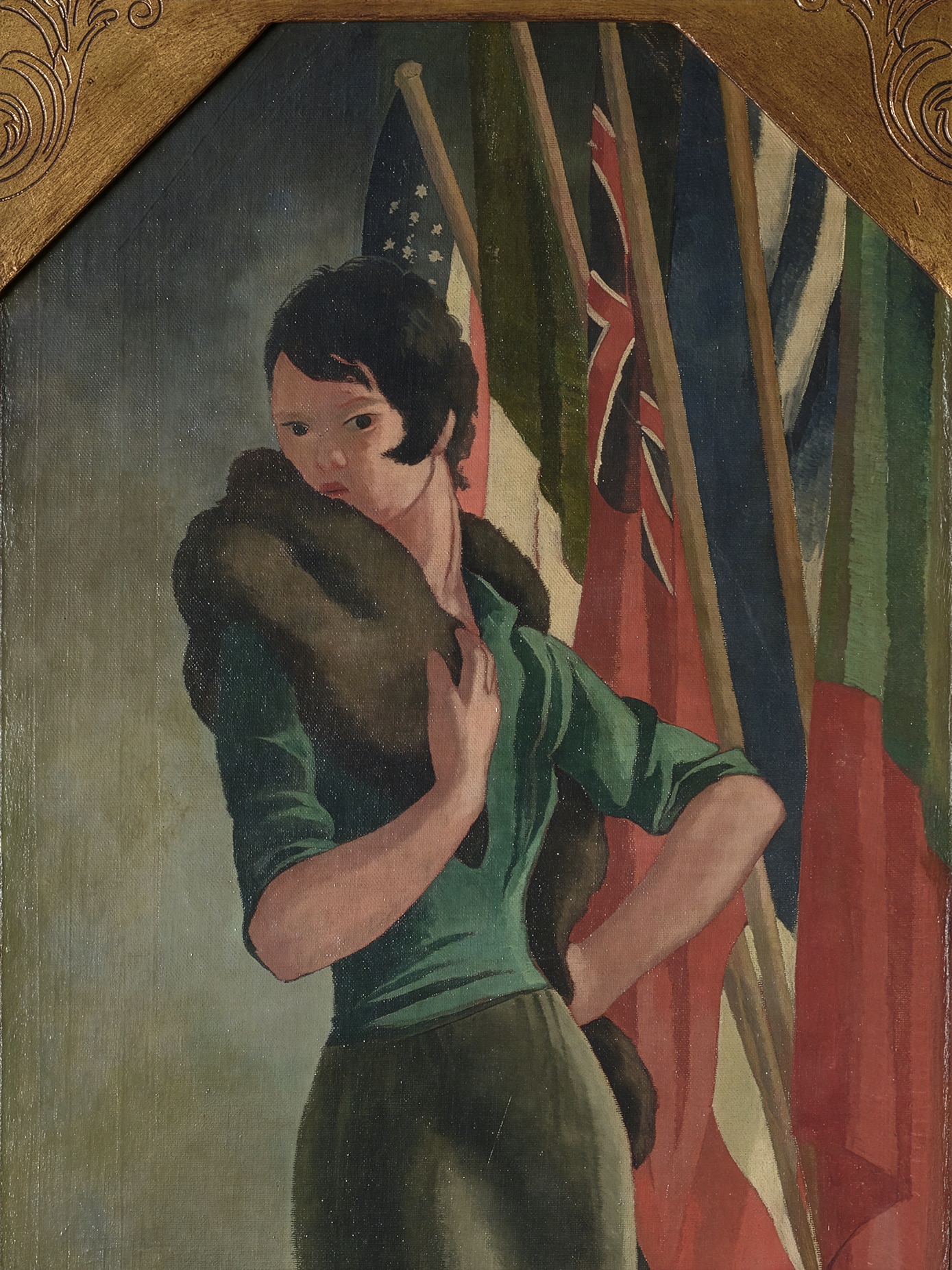 Al·legoria de la Rambla de Santa Mònica pertanyent a la decoració del Café de la Rambla, a Barcelona. Figura femenina dreta amb un conjunt de banderes darrera seu que al·ludeixen al darrer tram de la Rambla, on es trobaven més allotjament hotelers (entres aquests per exemple el Quatre Nacions). Forma part d’un conjunt de quatre obres; dues d’elles a la Col·lecció d’Art Modern de la Fundació Banc Banc Sabadell (núms. P0087 i P0088); l’altre en la Galeria Oba Art (Barcelona). En el revers etiqueta de l’antiga Galeria Syra (Passeig de Gràcia, 43 de Barcelona). En l’actualitat aquesta obra es troba dipositada a la galeria Oba Art al carrer de la Palla, 4 de Barcelona. Bon estat de conservació. Lleugers retocs a la falda de la figura i en el fons, a les banderes, però poc importants.