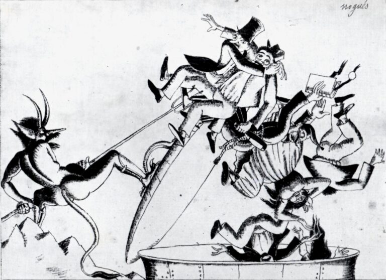 Dibuix de tall còmic on un dimoni fa introduir a una munió de personatges en una gran caldera. Il·lustra una de les sàtires (LIV) del llibre de Guerau de Liost.