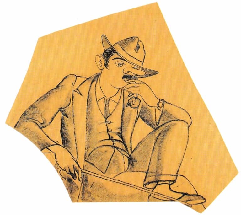Home dandi assegut. Esbós preparatori per a les pintures murals del menjador de la casa de Can Crespo, als peus de Montjuïc. Entre el 1929 i el 1930 Nogués realitza les pintures murals de Can Crespo com a penyora d’amistat i, tot i tractar-se d’una obra menor, l’artista realitzà, com sempre, de manera acurada i com tenia per costum, una sèrie de dibuixos preparatoris per als motius que decoraren les parets. En aquestes obres es deixa sentir la influència de l’art Deco, pel fet d’adaptar les pintures a l’ambient d’un habitatge del moment. Aquest dibuix va servir per decorar un panell mural que anava a la sobreporta.