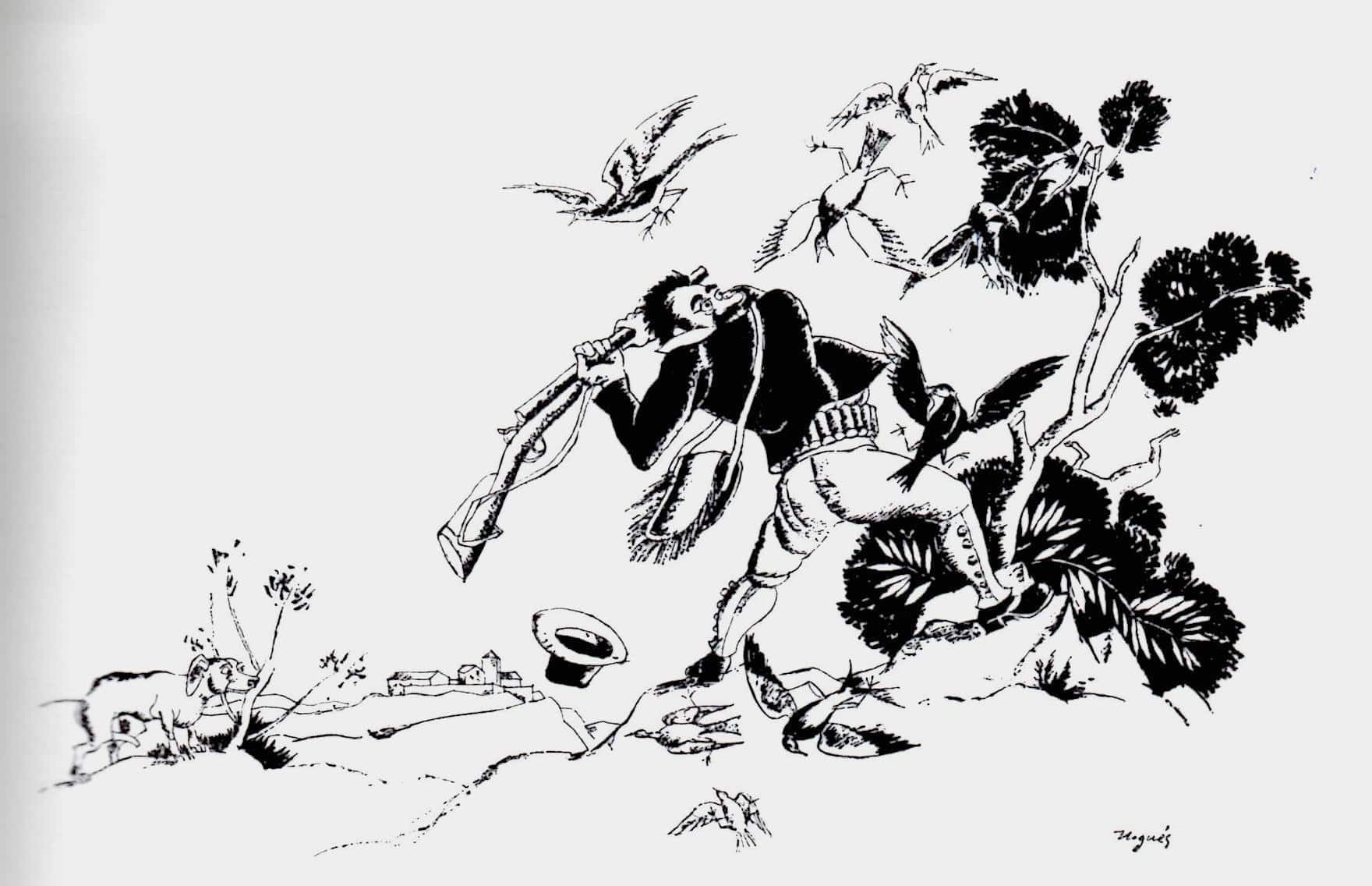 Figura d’un home matant ocells amb la culata de la seva escopeta.