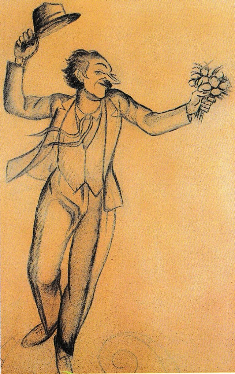 Figura d’home amb un pom de flors a una mà i alçant el barret amb l’altre. Esbós preparatori per a les pintures murals del menjador de la casa de Can Crespo, als peus de Montjuïc. Entre el 1929 i el 1930 Nogués realitza les pintures murals de Can Crespo com a penyora d’amistat i, tot i tractar-se d’una obra menor, l’artista realitzà, com sempre, de manera acurada i com tenia per costum, una sèrie de dibuixos preparatoris per als motius que decoraren les parets. En aquestes obres es deixa sentir la influència de l’art Deco, pel fet d’adaptar les pintures a l’ambient d’un habitatge del moment. Aquest dibuix va servir per decorar un panell mural que anava a la sobreporta.