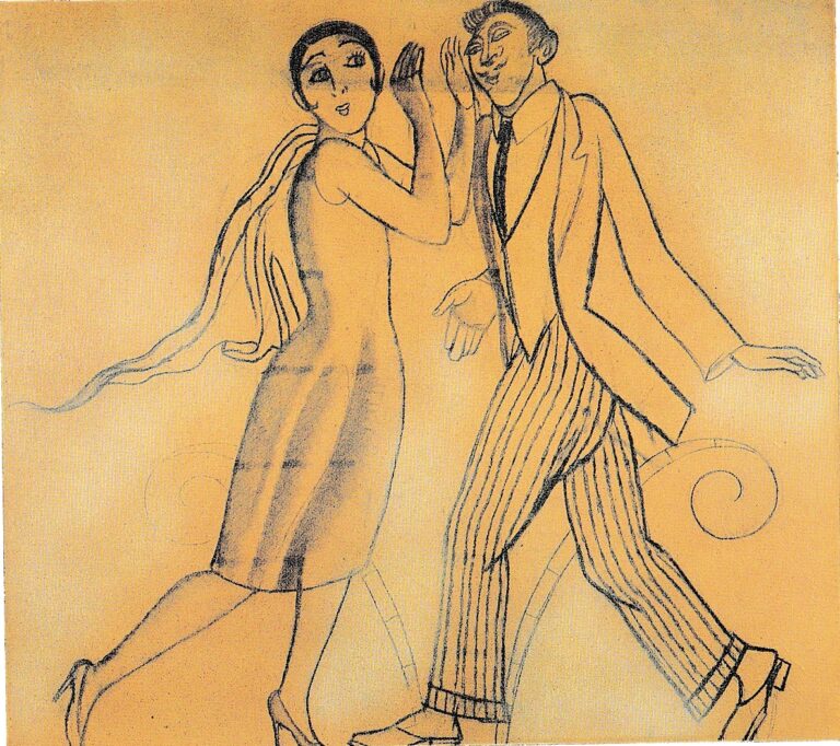 Una parella d’enamorats en actitud juganera i al més pur estil art Deco. Esbós preparatori per a les pintures murals del menjador de la casa de Can Crespo, als peus de Montjuïc. Entre el 1929 i el 1930 Nogués realitza les pintures murals de Can Crespo com a penyora d’amistat i, tot i tractar-se d’una obra menor, l’artista realitzà, com sempre, de manera acurada i com tenia per costum, una sèrie de dibuixos preparatoris per als motius que decoraren les parets. En aquestes obres es deixa sentir la influència de l’art Deco, pel fet d’adaptar les pintures a l’ambient d’un habitatge del moment.