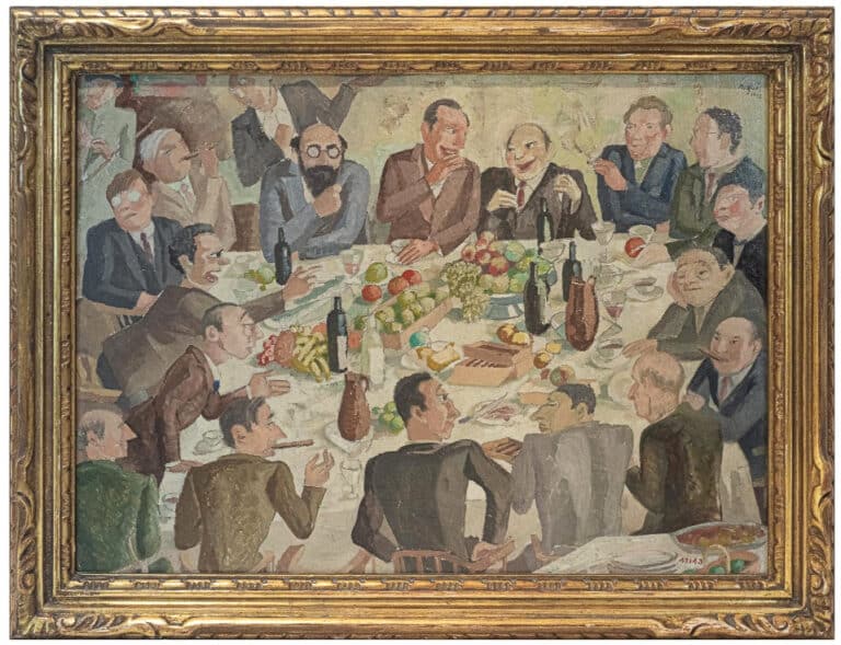 This small painting is a preparatory sketch for the wall painting “The Colon Circle” (destroyed in 1936) by Xavier Nogués and Manuel Humbert. It was done in tempera and was displayed at the prestigious Hotel Colón, which stood on the corner of Plaça Catalunya and Passeig de Gràcia. The hotel opened in 1902, and was home to Barcelona’s most high-class café and restaurant. It was a meeting place for a number of artists who were steeped in the spirit of the art movement noucentisme, under the auspices of their patron and friend, the industrialist and collector Lluís Plandiura (Barcelona, 1882-1956). In 1936 a group of anarchists entered the hotel and subjected the painting to rounds of machine gun fire as, to them, it symbolised the “bourgeoisie” they were fighting against. Two more paintings by Nogués also disappeared, one recreating a café scene in the 1830s and another of the bar in 1934 in which Nogués portrayed himself as a barman. Lluís Plandiura kept this preparatory sketch of the painting of the literary gatherings held by the “Penya del Colón”, or Colón circle. The empty chair is in honour of Ricard Canals who died in 1931.