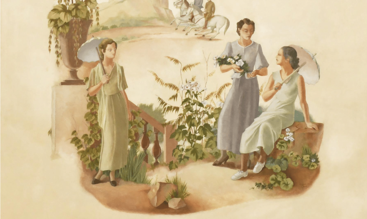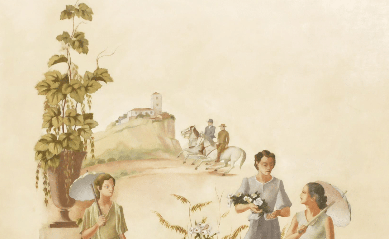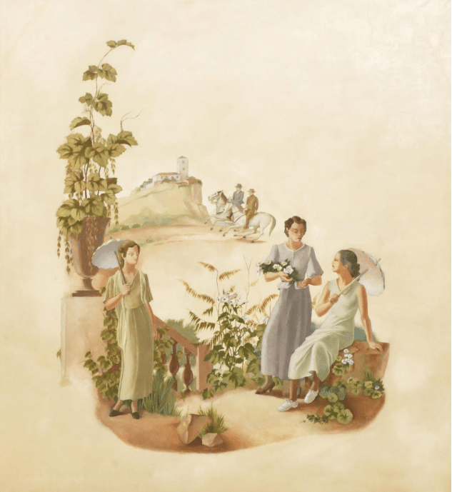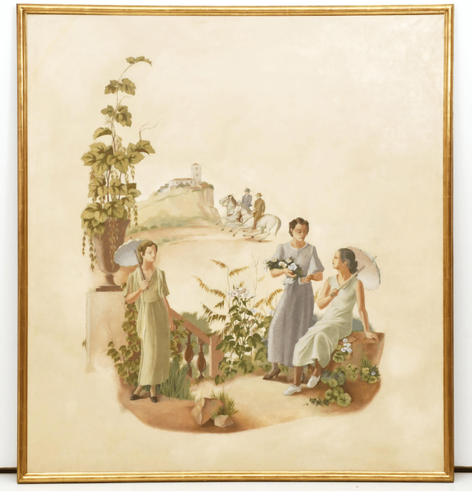 Tres elegants dames en primer terme, algunes d’elles amb ombrel·les, en un ambient floral. Al fons es desplega un paisatge amb dos genets a cavall i una torre sobre un turó.