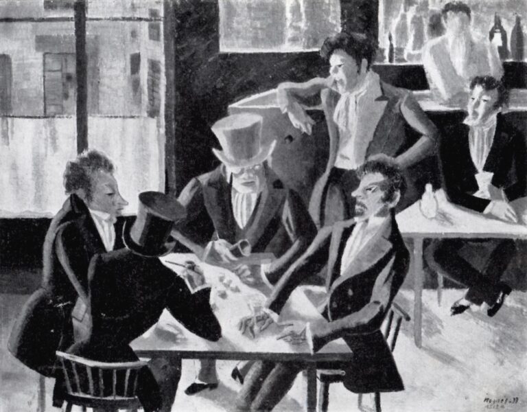 Esbós preparatori per a la pintura que decorava un dels panells de l’Hotel Colón de Barcelona, situat a la cantonada entre Plaça Catalunya i Passeig de Gràcia. Inaugurat el 1902, fou el café-restaurant de més categoria de la ciutat. Va ser lloc de trobada de diversos artistes empeltats pel noucentisme, aixoplugats sota el paraigües del mecenes i amic Lluís Plandiura. El 1936 un grup d’anarquistes van entrar al local i van afusellar diverses obres atès que per a ells simbolitzava aquella “burgesia” contra la que lluitaven (en la versió definitiva es comenta que Nogués s’autoretratava en forma de “barman”).