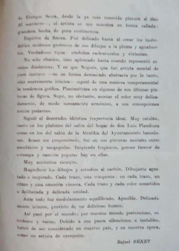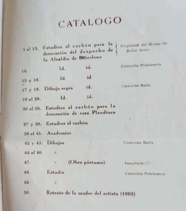Fulletó / catàleg de l’exposició celebrada a la sala barcelonina La Pinacoteca (Passeig de Gràcia, 34), del 23 de setembre al 6 d’octubre de 1944 (pòstuma a la mort de l’artista). Text introductori de Rafael Benet. 4 pàgines. Catàleg amb les 50 obres llistades a l’exposició (dibuixos per al despatx d’honor de l’alcalde a l’Ajuntament de Barcelona, de les col·leccions Plandiura, Badia, Pidelaserra, estudis, acadèmies, dibuixos, etc.).