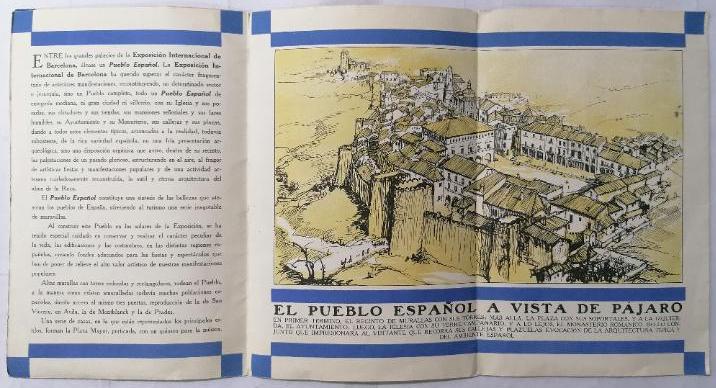 Fulletó desplegable promocional de l’Exposició Internacional de Barcelona del 1929 que mostra un dibuix panoràmic d’“El Pueblo Español a vista de pájaro”, fotografies dels edificis més destacats del recinte, així com un plànol general. Editat per I. G. Seix y Barral Hnos, Barcelona, 1929.