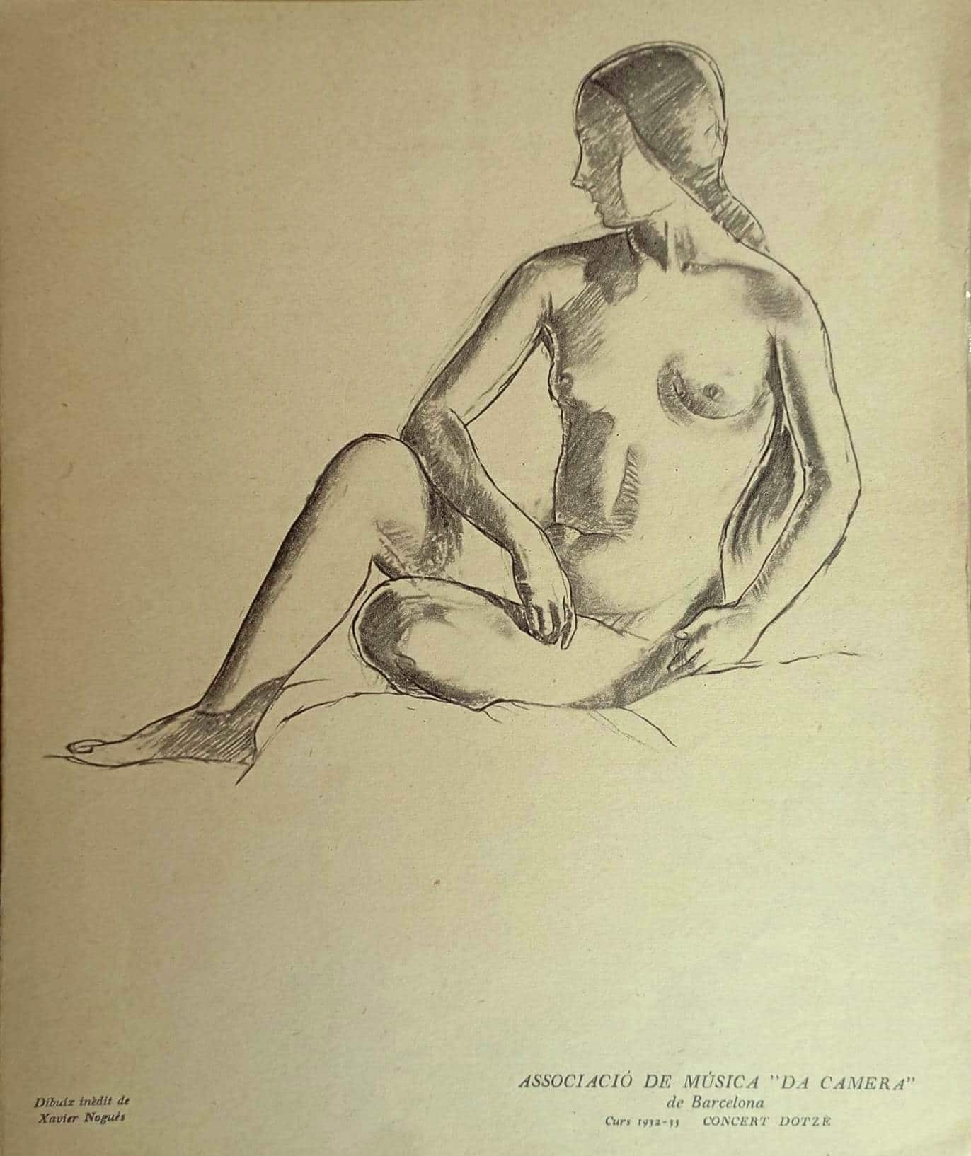 Per la temporada 1932-1933 Xavier Nogués realitzà diverses portades dels programes de mà dels concerts organitzats per l’Associació Música “da Càmera” de Barcelona celebrats al Palau de la Música catalana. Van ser impresos a l’Institut Grafic Oliva de Vilanova i la Geltrú, 1932. El programa del dotzè concert mostra una figura femenina nua de la que no s’ha trobat la referència o font que la inspira.