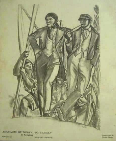 Per la temporada 1932-1933 Xavier Nogués realitzà diverses portades dels programes de mà dels concerts organitzats per l’Associació Música “da Càmera” de Barcelona celebrats al Palau de la Música catalana. Van ser impresos a l’Institut Grafic Oliva de Vilanova i la Geltrú, 1932. El programa del primer concert mostra un indià acompanyat d’un grup de mariners i parteix del dibuix preparatori del mural decoratiu del despatx d’honor de l’alcalde a l’Ajuntament de Barcelona, conegut com “L’aventurer i el capità” o “L’indià o l’aventurer”.