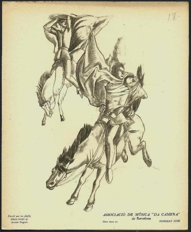 Per la temporada 1932-1933 Xavier Nogués realitzà diverses portades dels programes de mà dels concerts organitzats per l’Associació Música “da Càmera” de Barcelona celebrats al Palau de la Música catalana. Van ser impresos a l’Institut Grafic Oliva de Vilanova i la Geltrú, 1932. El programa del sisè concert mostra uns jenets sobre uns cavalls en cursa i parteix del dibuix preparatori del mural decoratiu del despatx d’honor de l’alcalde a l’Ajuntament de Barcelona, titulat “El renaixement espiritual de Catalunya”.