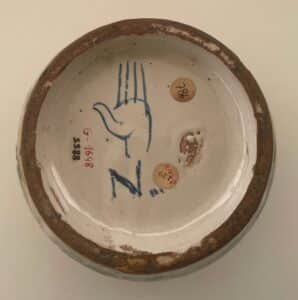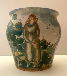 Gerro troncocònic amb la part superior bombada i la vora lleument exvasada. Decorat amb cinc figures, dos nois i tres noies, distribuïdes al voltant de la peça, sobre un fons de paisatge rural amb petits nuclis de població. Llegat de la col·lecció Salvador Riera. Va ingressar al museu el març del 1996 i va ser exhibit entre març i juny d’aquell any en motiu de la inauguració de la remodelació del Museu Víctor Balaguer.