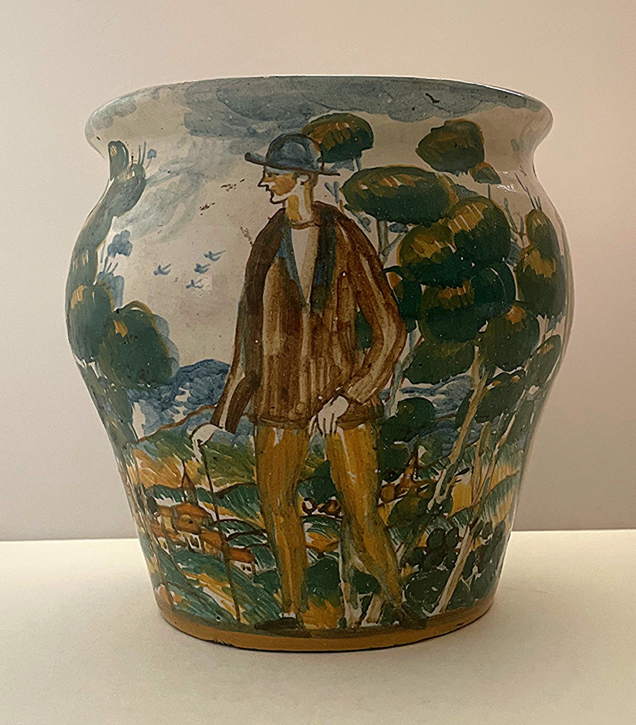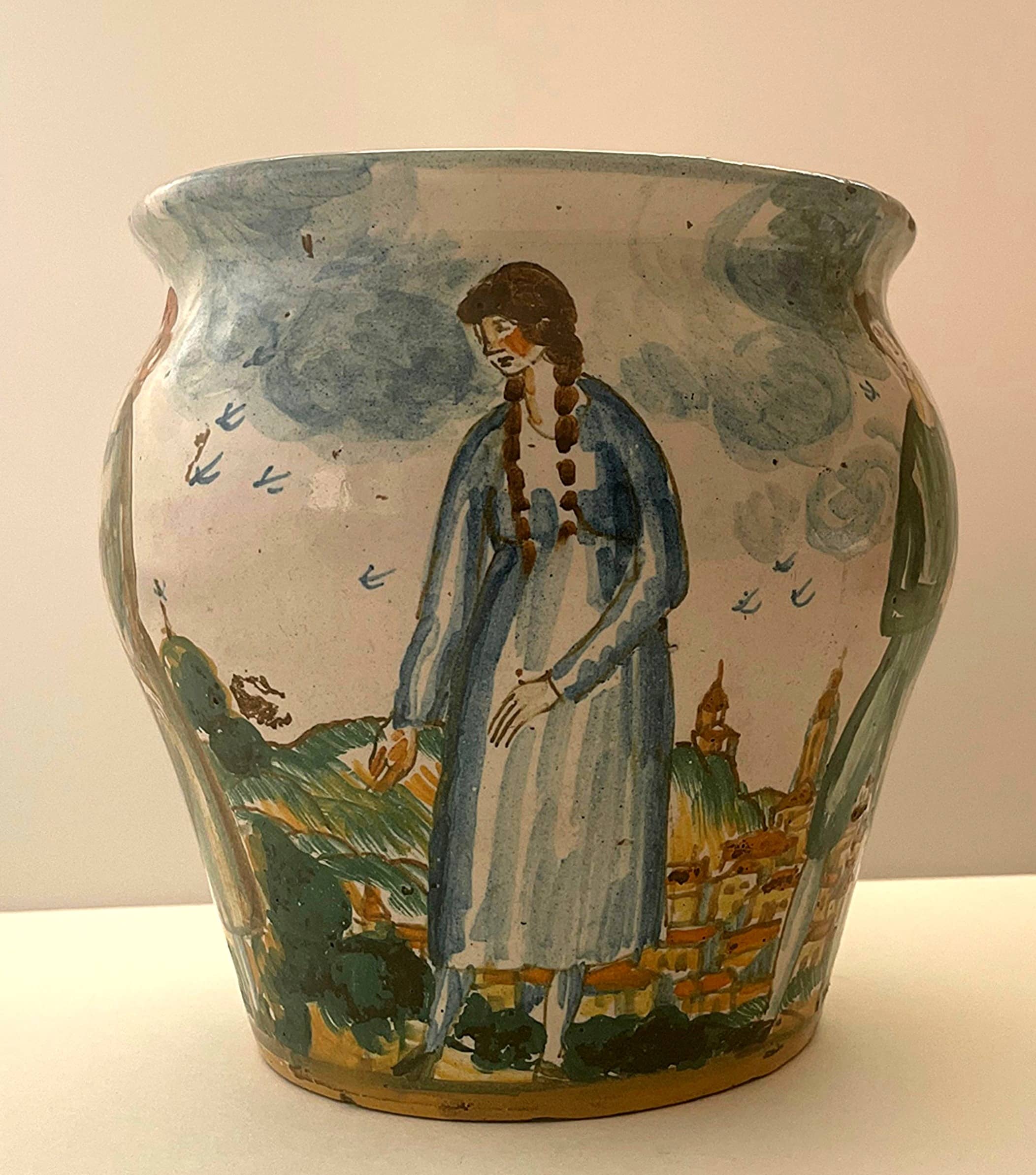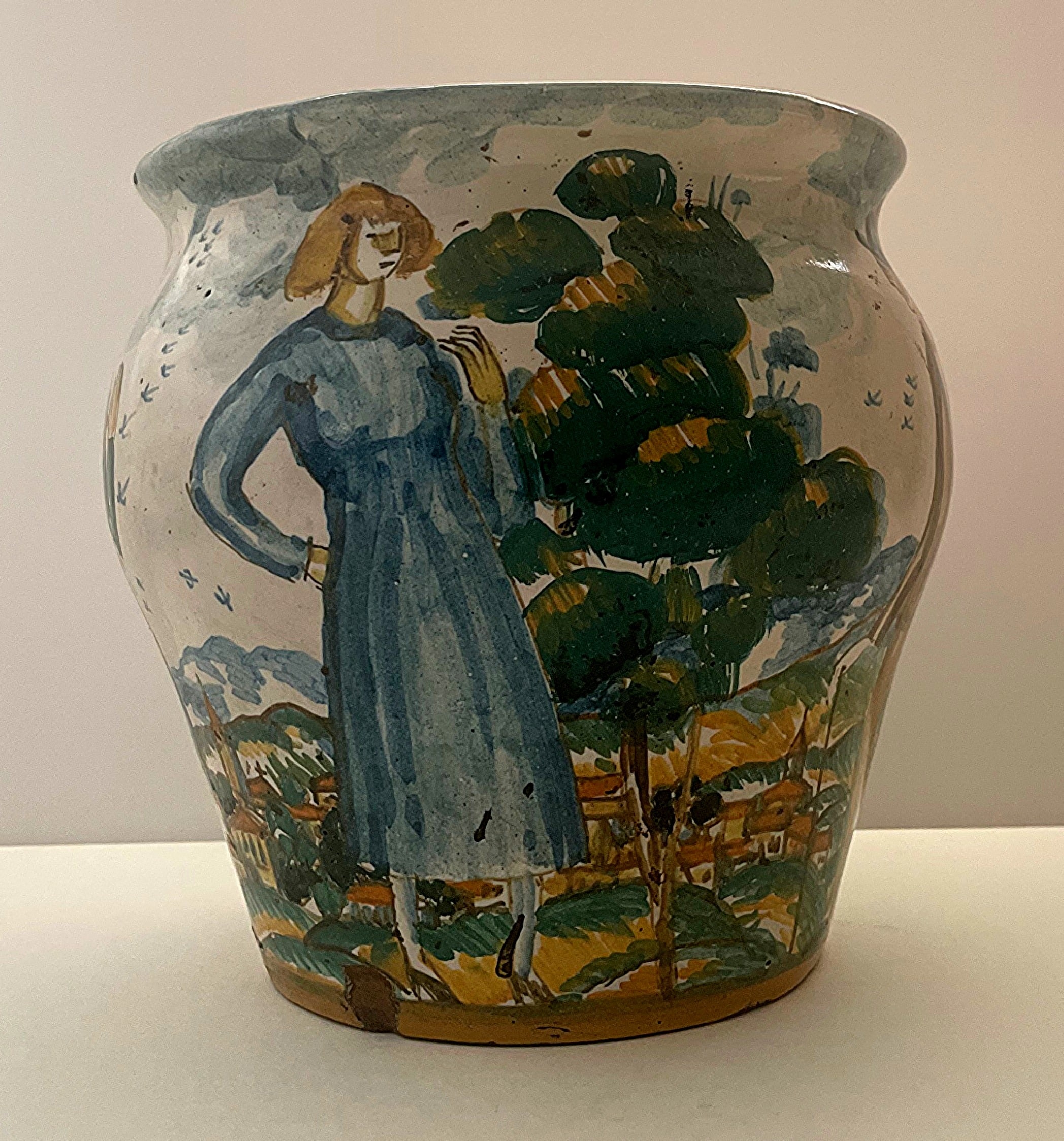 Gerro troncocònic amb la part superior bombada i la vora lleument exvasada. Decorat amb cinc figures, dos nois i tres noies, distribuïdes al voltant de la peça, sobre un fons de paisatge rural amb petits nuclis de població. Llegat de la col·lecció Salvador Riera. Va ingressar al museu el març del 1996 i va ser exhibit entre març i juny d’aquell any en motiu de la inauguració de la remodelació del Museu Víctor Balaguer.