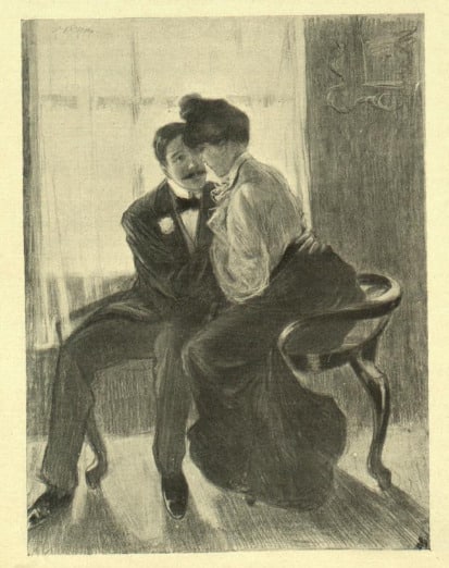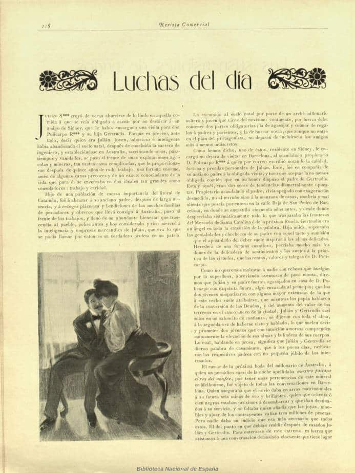 Primera de les tres il·lustracions d’estil plenament modernista per a il·lustrar un conte d’Artur Masriera: Luchas del dia. Al final del text s’indica que les il·lustracions son obra de Francisco Javier Nogués.