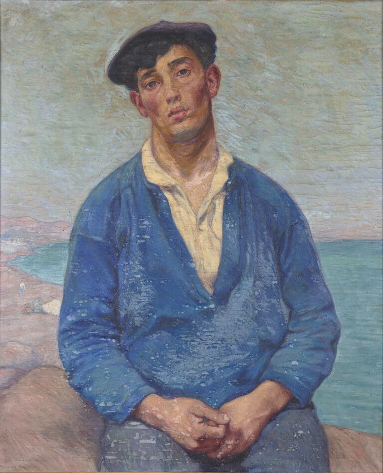 Figura aillada de mariner assegut, amb el cap lleument de costat, vestit de blau amb una camisa blanca i barret. Al fons un paisatge mariner on s’observen figures arreglant xarxes i edificis en la llunyania. És un dels pocs retrats realitzats per Nogués en la seva pintura de cavallet. En l’angle inferior esquerra es llegeix: “Al amich Serra / Francesc Xavier Nogués” i en un altre color, potser afegida després, la data: “1908”. Obra dedicada al ceramista modernista i bon amic de Nogués Antoni Serra i Fiter.
