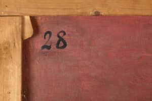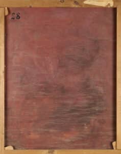 Presenta un acceptable / bon estat de conservació però s’aprecien alguns repints posteriors, bufats en la pintura i també alguns clivellats. En el revers a dalt a l’esquerra, a tinta: “28” probablement de l’inventari dels béns d’Antoni Serra, tal i com ens comenta el seu nét, Jordi Serra. Resta d’antiga etiqueta de paper al revers en el marc, estripada i il·legible.