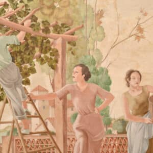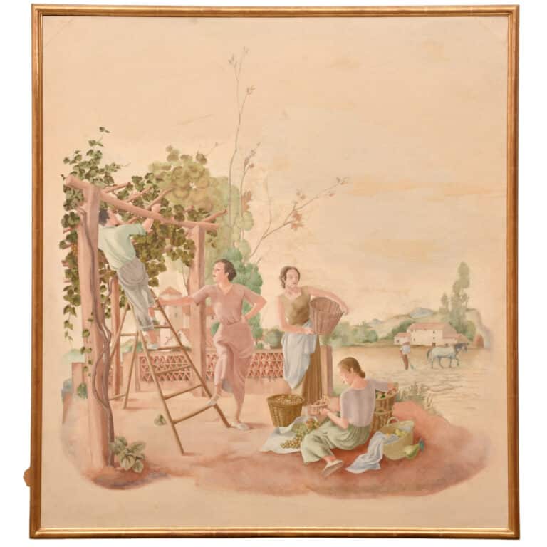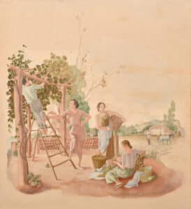 Tres dones feinejant amb cistelles de vímet recollint el raïm, un home enfilat a una escala en una parra i un paisatge rural de fons amb pagès i cavall llaurant un camp. Aquesta obra va pertànyer als murals per a la decoració del saló menjador de la casa de Lluís Plandiura a la Garriga (1936). Constaven de tres plafons amb els següents temes: “La Pesca i La Caça”, “Estiu” i “Verema” (els dos darrers també els trobem referenciats com “Les flors” i “La fruita”).