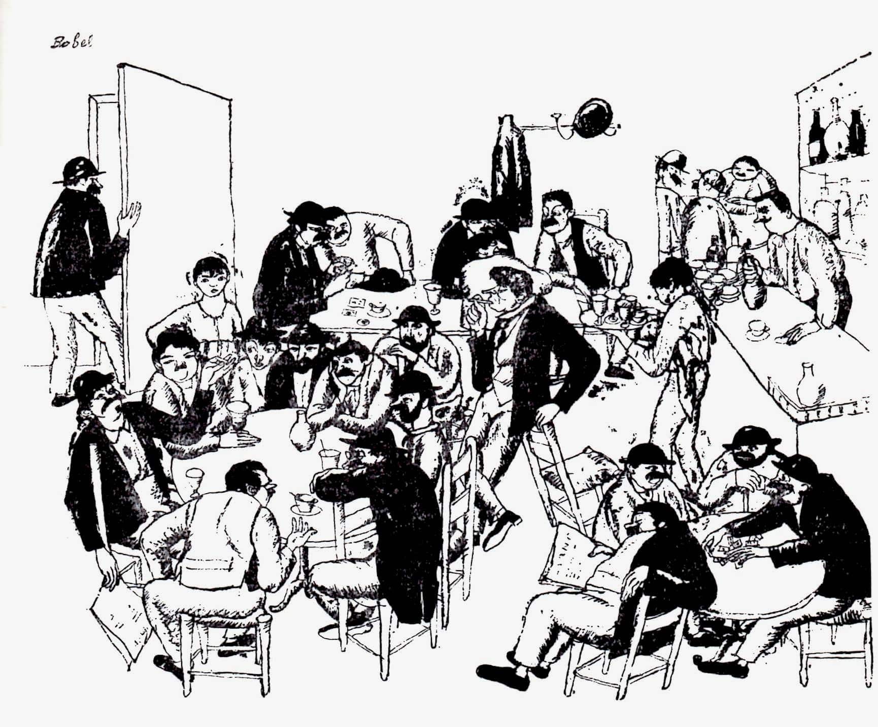 Escena de taverna amb molts personatges masculins, un dels quals, l’Anton marxa per la porta.